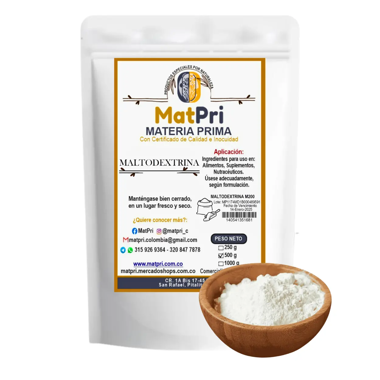 * Estimado Cliente, todas nuestras materias primas cuentan con su respectiva certificación de Calidad e Inocuidad. MatPri es una Empresa Comercializadora de materias primas a granel para la Industria de alimentos, bebidas y sabores. Recomendamos hacer uso adecuado de la materia prima. No damos consejos sobre nutrición, recomendamos siempre acudir a un profesional del área. Los suplementos alimenticios no deben utilizarse como sustitutos en una dieta equilibrada. Una vez abierto el producto, no se acepta su devolución. Para MatPri es un gusto ofrecer la mayor calidad al menor precio.